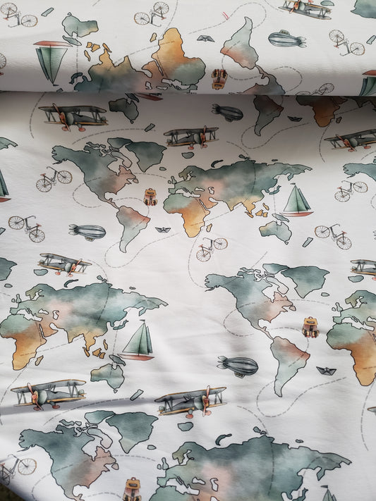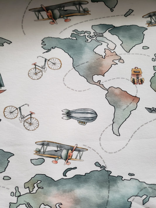 Reststück 1,20m French Terry, Gots Sommer Sweat Stoff, Boho Weltkarte, pastell Töne