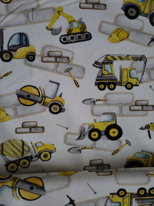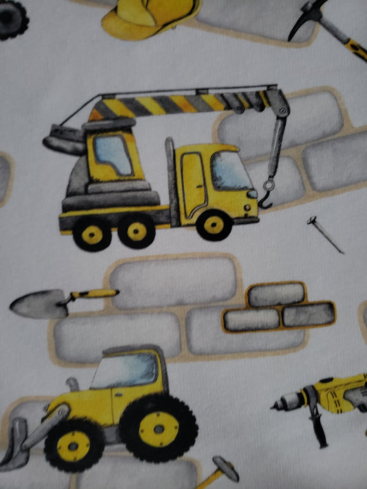 Reststück 74cm French Terry, Sommer Sweat, Baumwolle, Stoff, weiß gelb grau, Baustellen Fahrzeuge