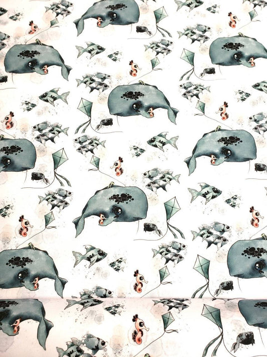AusverkauftJersey, Stoff, weiß blau Wale, Aquarell