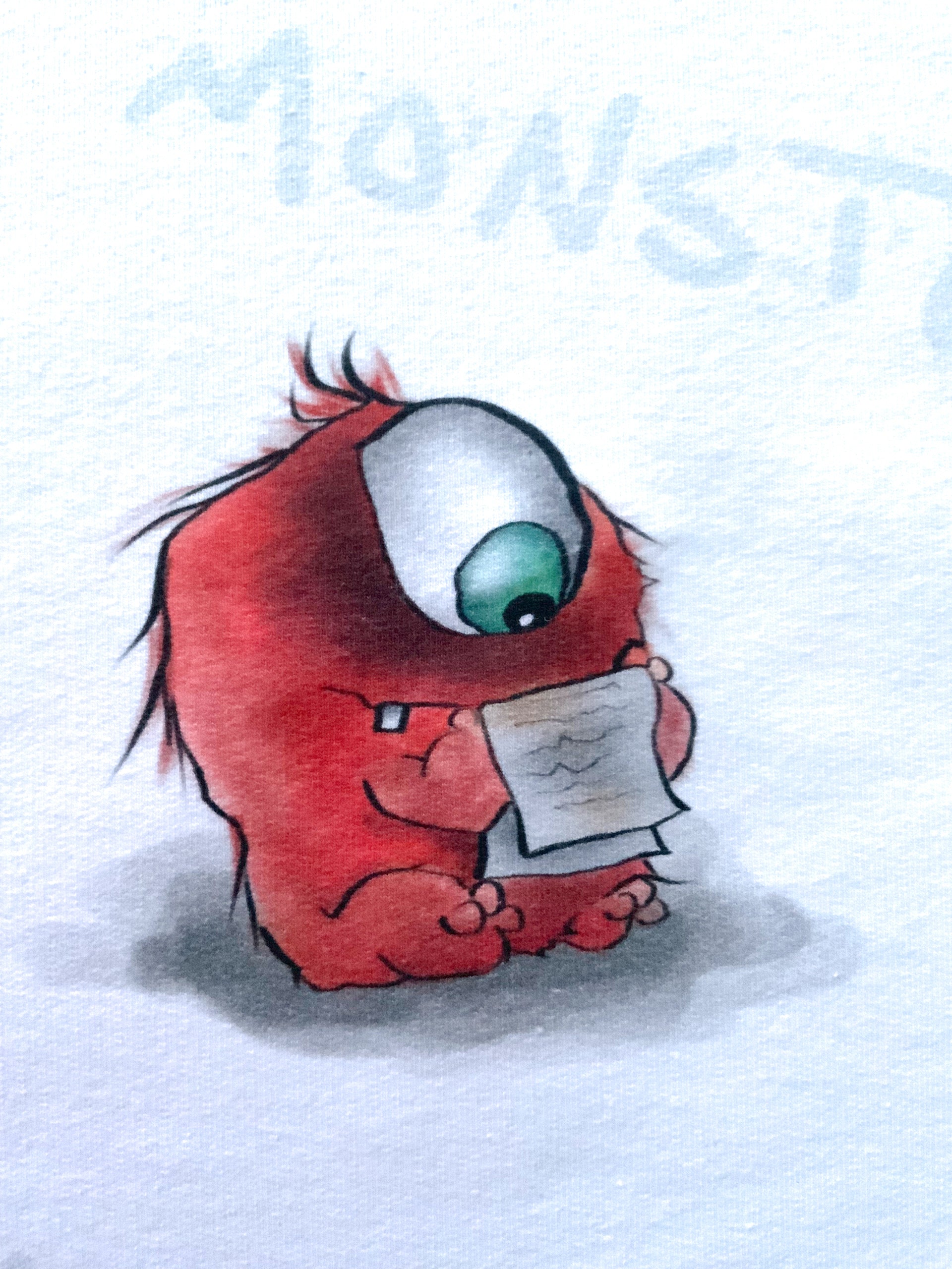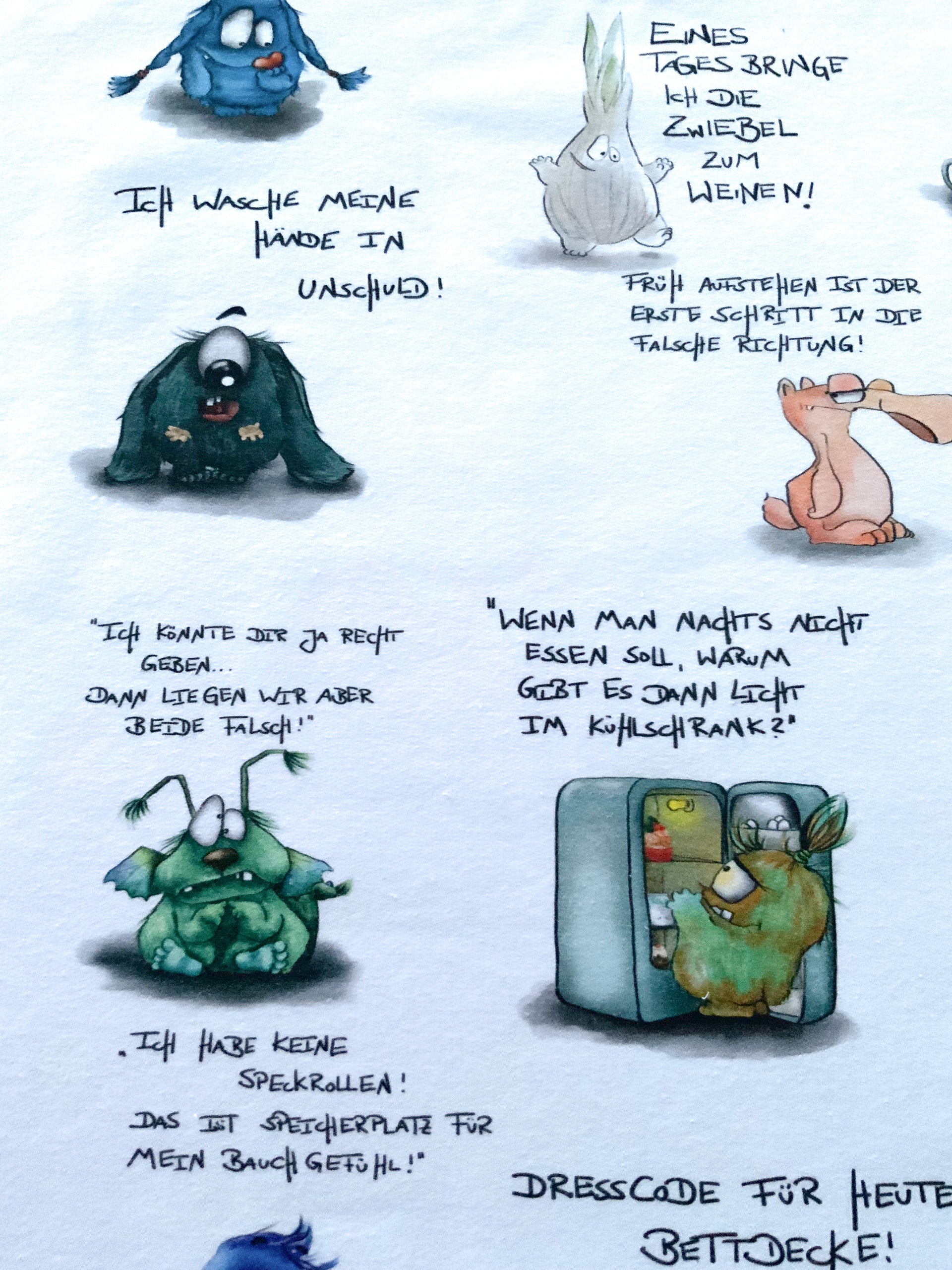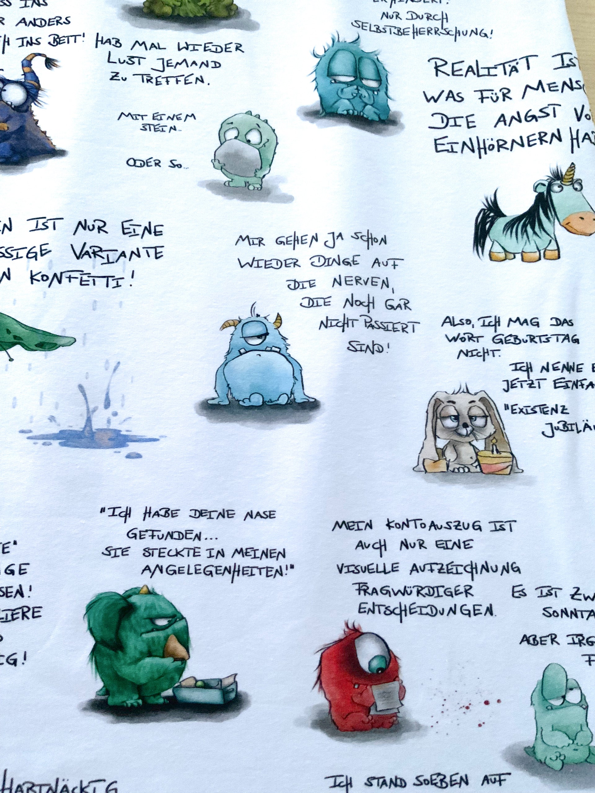 0,5m Organic French Terry, Stoff, Eigenzeichnung, Monster mit Sprüchen auf weiß Klassiker