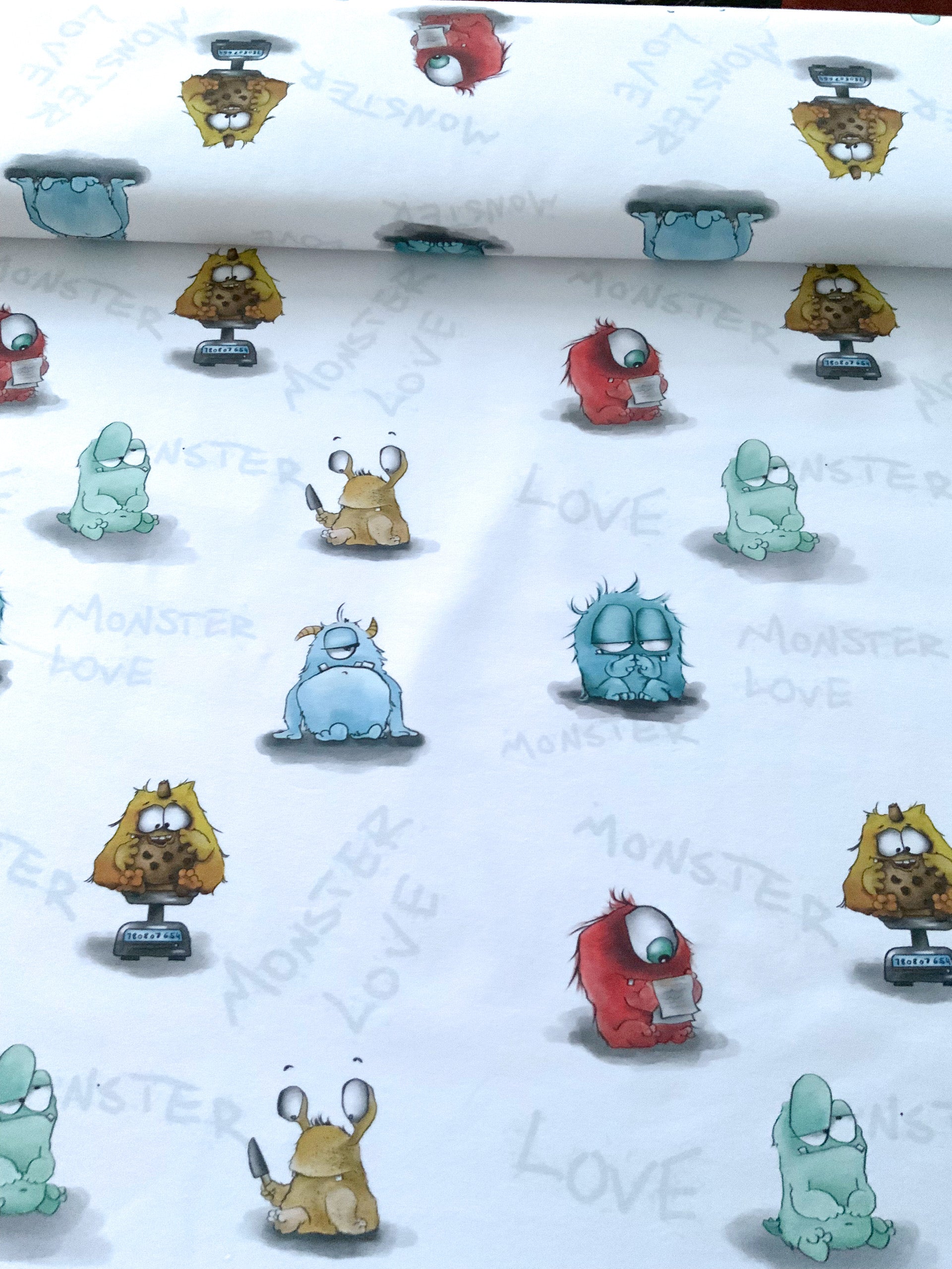 Organic French Terry Stoff, Eigenzeichnung, Monster Love auf weiß Klassiker
