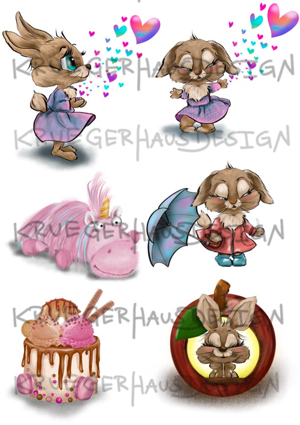 Hier bekommst du ein DIN A4 Blatt mit süßen selbstgezeichneten Hasen und Plüscheinhorn. Die Größe entnimmst du bitte auf dem Foto.