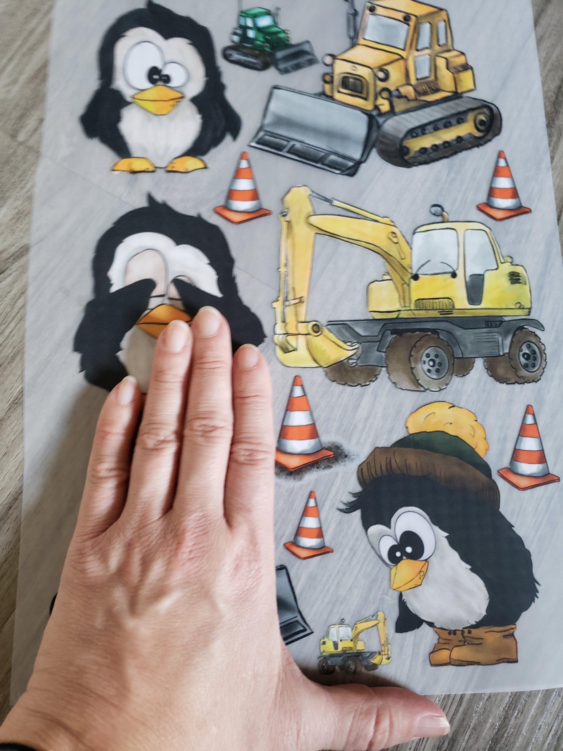 A4 Bügelbild Piper der Pinguin auf der Baustelle , mit Liebe illustriert