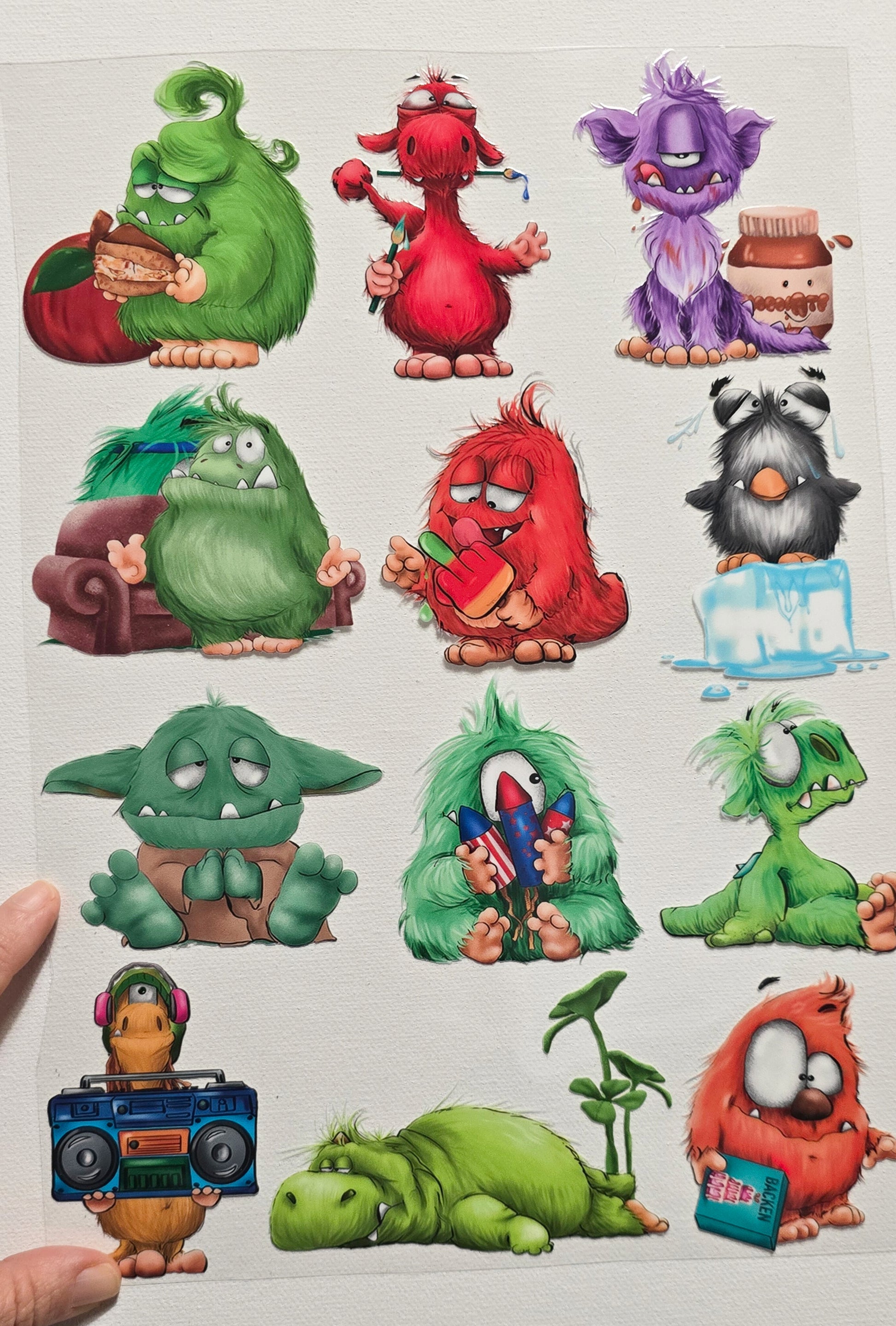 B-Ware Rub on, UV Folienaufkleber, A4 Blatt, Design 3,unterschiedlich Monster, ein Fehler
