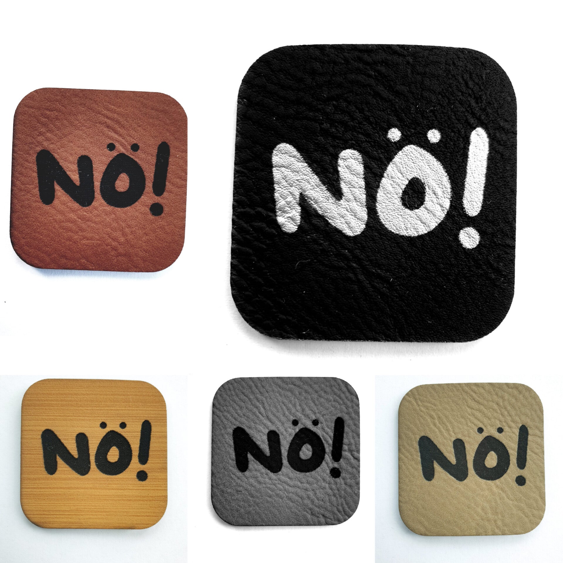 Kunstleder Label, Patch, Etikett, Aufnäher, NÖ! , Laser graviert, braun, grau, beigebraun, bambus, schwarz