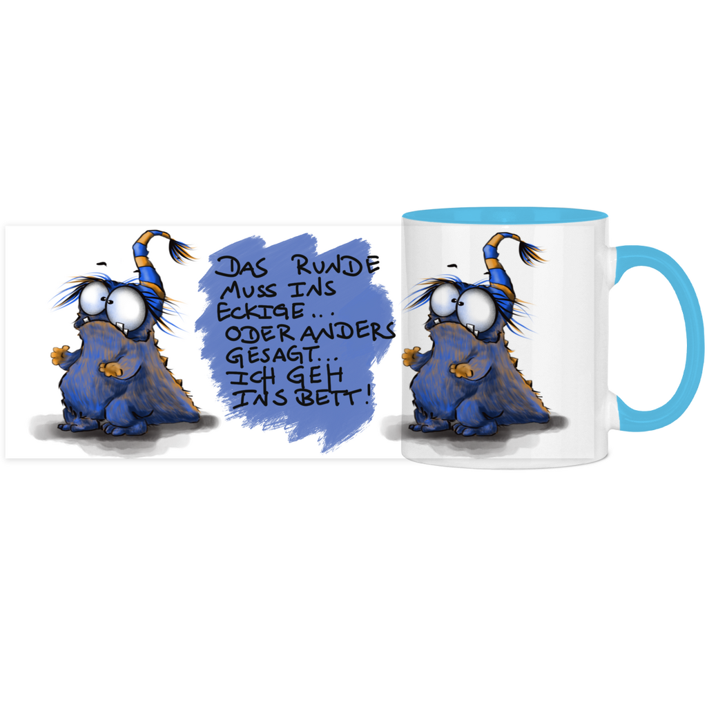 Tasse, Kaffeetasse, Teetasse, zweifarbig, Kruegerhausdesign Monster mit Spruch, 2. Variante, Das Runde muss ins Eckige...