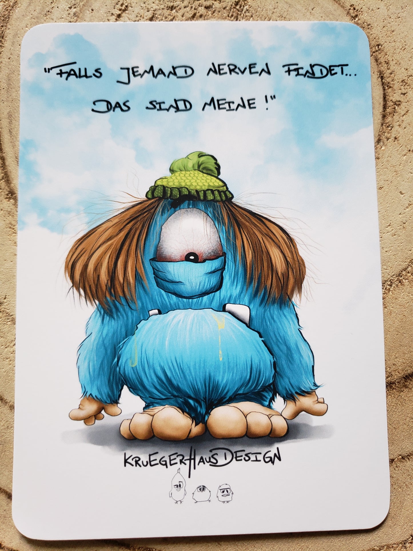 Postkarte Monster Kruegerhausdesign "Falls jemand Nerven findet..."