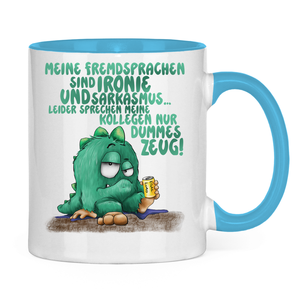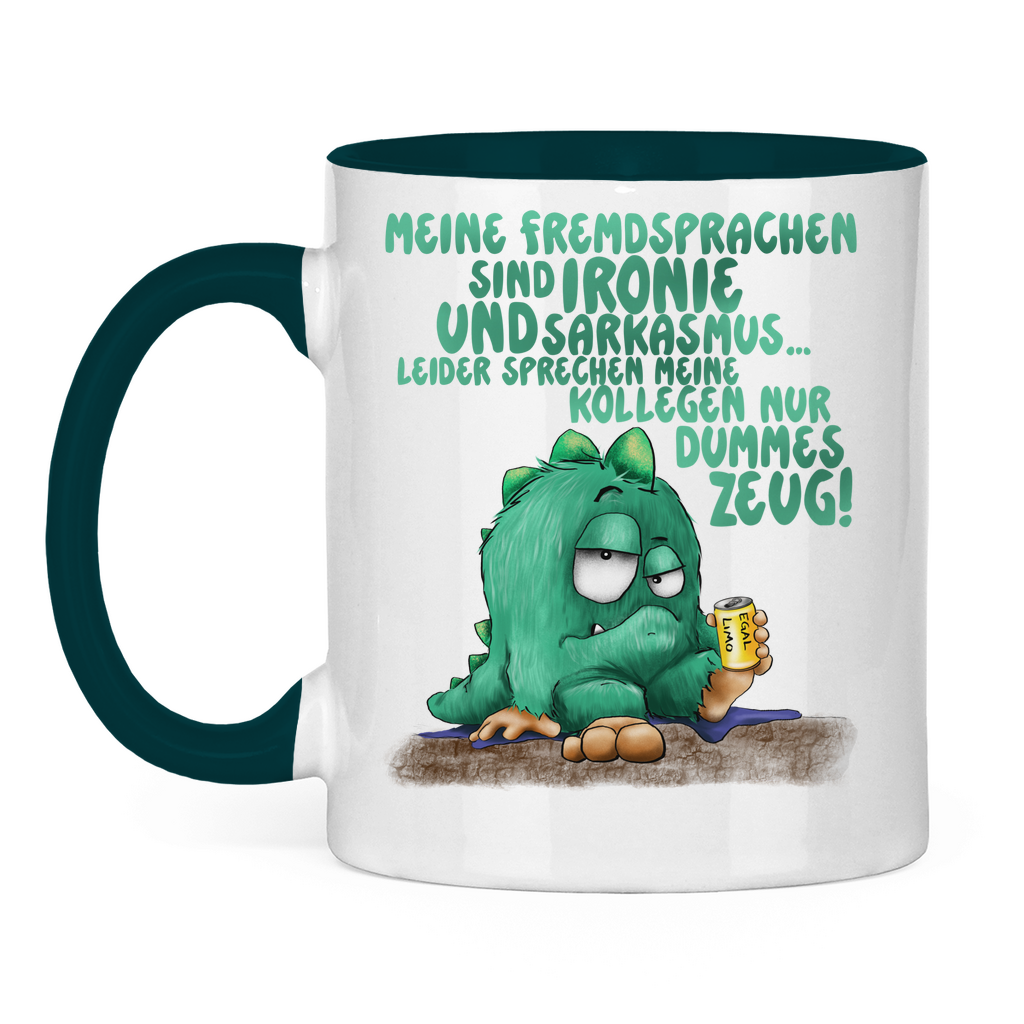 Tasse zweifarbig Meine Fremdsprachen sind Ironie und Sarkasmus.
